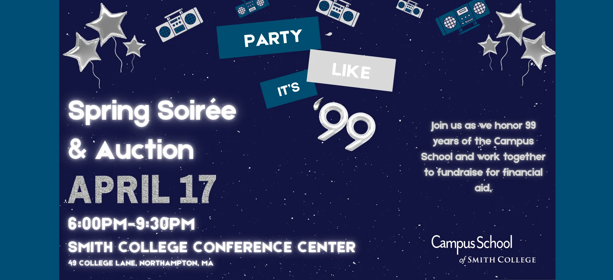 In honor of the Campus School’s 99th year, this year’s celebration has a playful 1990s theme. Held this year at the Smith College Conference Center, guests can expect a lively dance floor, music from a decade many of our alumni remember well, and plenty of opportunities to reconnect with friends and teachers.